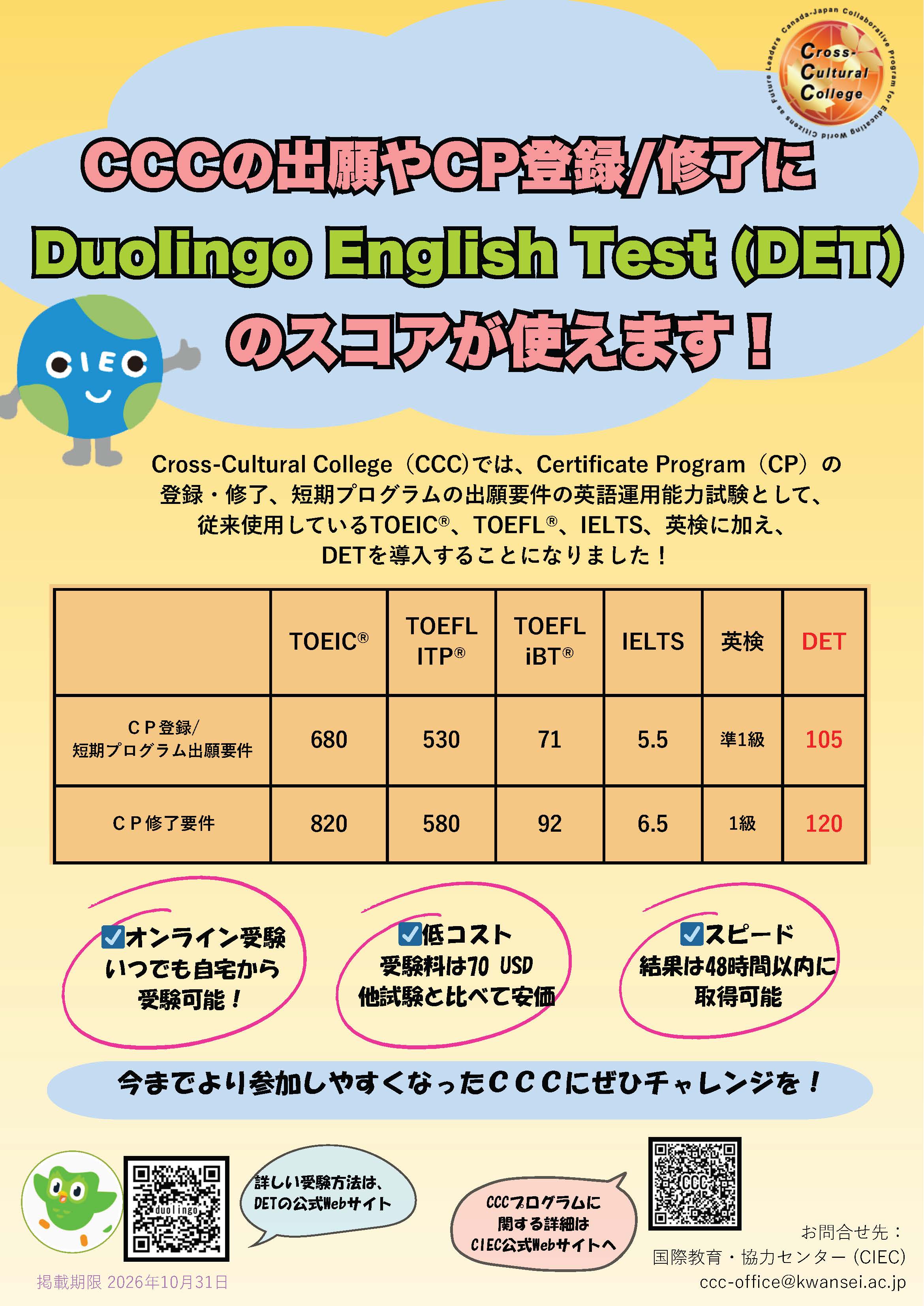 CCCプログラムに、Duolingo English Test(DET)を利用できるようになりました!