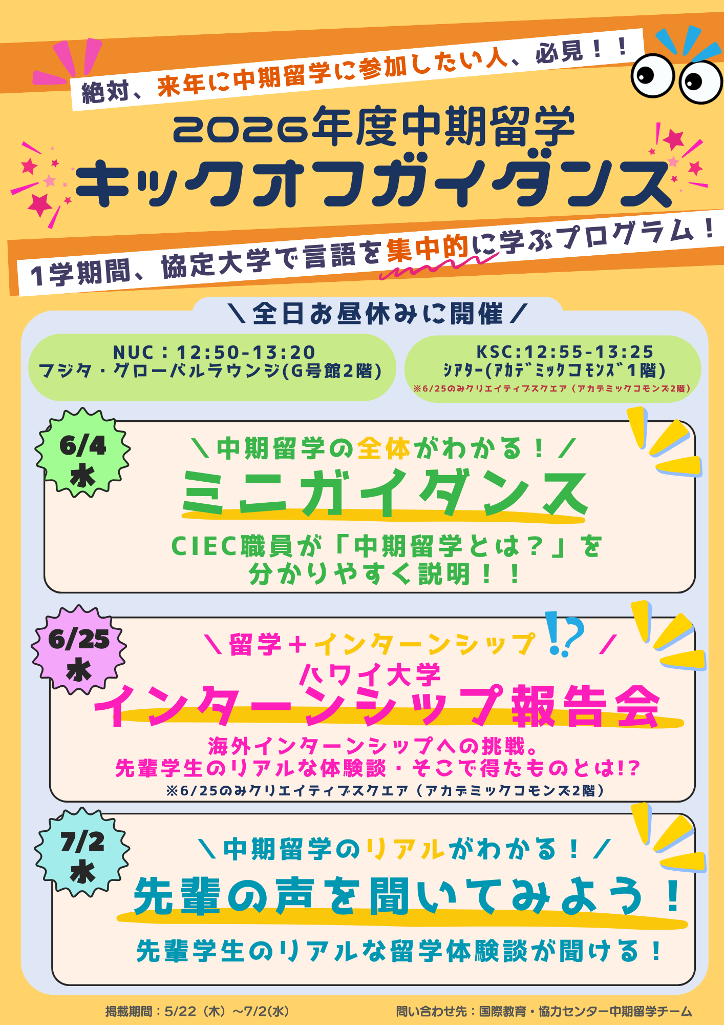 2026年度中期留学のキックオフガイダンスを実施します!!