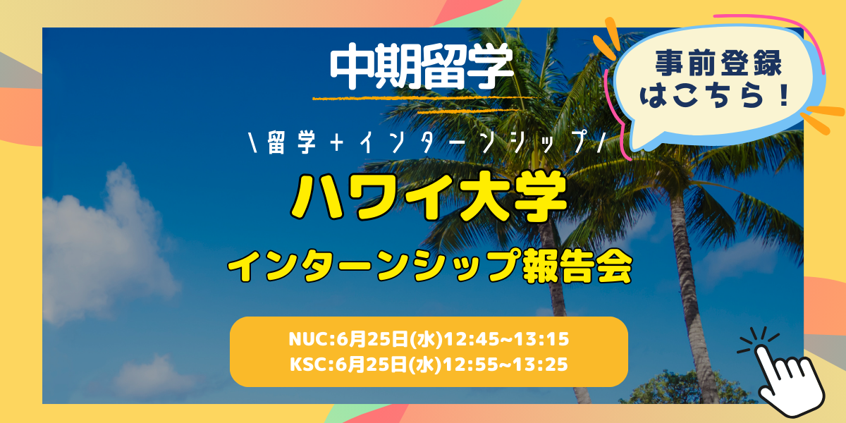 CIEC職員による「ミニガイダンス」や中期留学に参加した先輩学生による「ハワイ大学インターンシップ報告会」・「先輩の声を聞いてみよう!」など盛りだくさんの内容でお届けします!